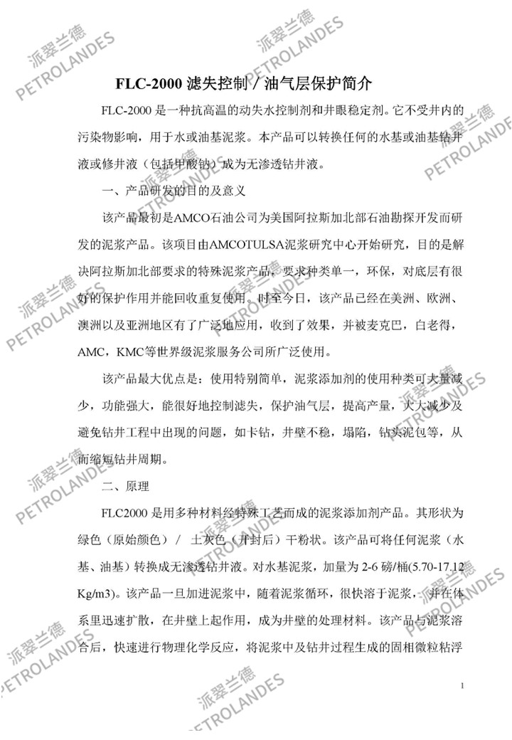 FLC-2000是一种抗高温的动失水控制剂和井眼稳定剂。它不受井内的污染物影响,用于水或油基泥浆。本产品可以转换任何的水基或油基钻井液或修井液(包括甲酸钠)成为无渗透钻井液。